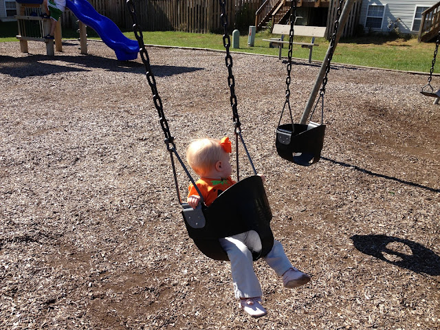When we got home we ate lunch and I thought for sure EC would be so ready for a nap, but she wasn't. Shows what I know! Ha! So I put some play clothes on her and we headed outside. Yesterday Emma Claire's Daddy "red neck baby proofed" her cozy coup. He screwed some boards in the bottom so that she has a little foot rest and can't drag her feet. The newer models have a removable floor board to keep baby toes safe. Well what can I say...Emma Claire's is a $3 yard sale find that needs some TLC and it does NOT have a fancy floorboard! ha! She doesn't seem to mind though!