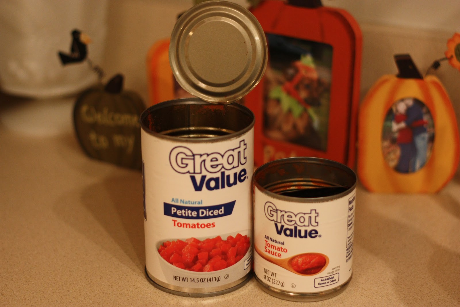 Welcome to Tasty Treat Thursday everyone! Today's recipe is what I made last night for dinner. I had a screaming baby at my feet and no time to cook. So I grabbed some fresh pork chops from the fridge, a can of tomato sauce , and a can of diced tomatoes.